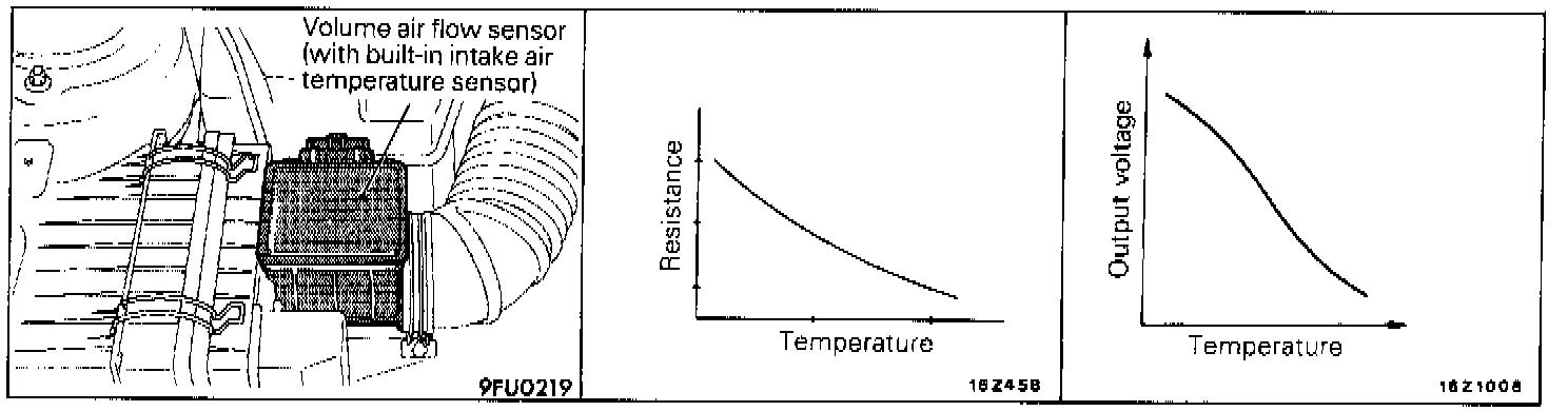 The intake air temperature sensor terminal voltage increases or decreases as the sensor resistance increases or decreases. Therefore, the intake air temperature sensor terminal voltage changes with the intake air temperature, decreasing as the temperature rises.