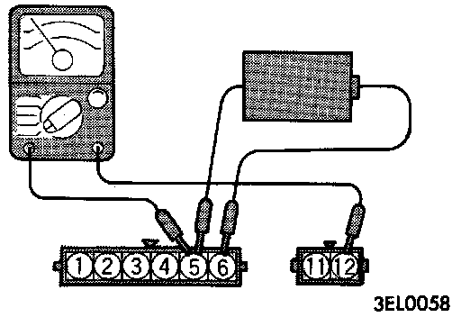 1. Connect the negative (-) terminal of the 1.5V power supply to terminal 5 of the [1][2]ignition power transistor; then check whether there is continuity between terminal 5 and terminal 12 when terminal 6 and the positive (+) terminal are connected and disconnected.