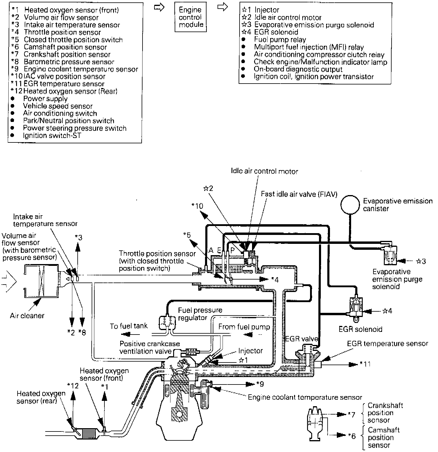 Normally, fuel injection takes place from cylinder to cylinder once every two revolutions of the crankshaft in the order of No.1, No.3, No.2 and No.4 cylinders. This is called sequential multiport fuel injection (SF1) control. When the engine is cold or it is operated under a heavy load, ECM goes to "open loop" control to enrich the mixture for maintenance of driveability. In normal operation, warm engine, the oxygen sensor signal is used to perform "closed loop" control, which controls the mixture so as to have the theoretical air fuel ratio best for purification performance of the three-way catalyst.