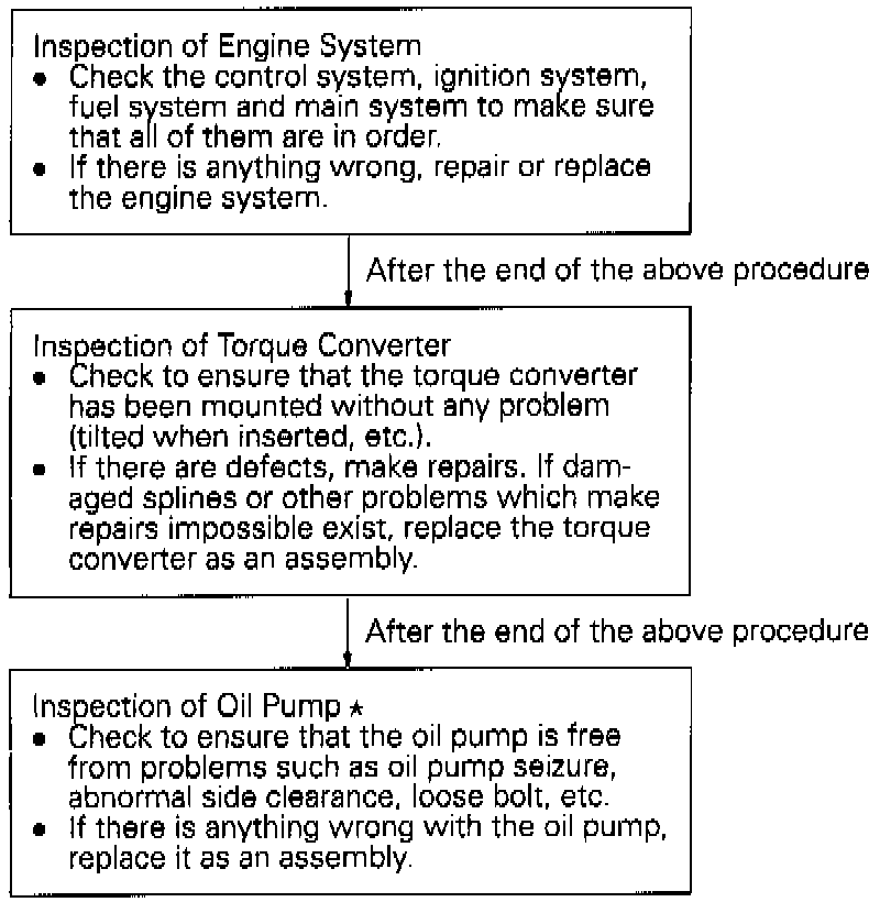 When the engine fails to start with the selector lever at positions P and N, it is likely that the engine system, torque converter and/or oil pump is out of order.