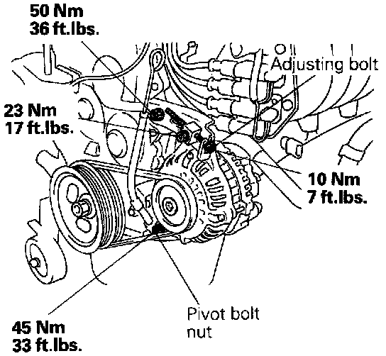 5. After adjusting the belt tension, fully tighten the nut of the pivot bolt and the lock bolt to the specified torque, and then tighten the adjusting bolt to the specified torque.