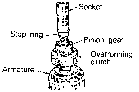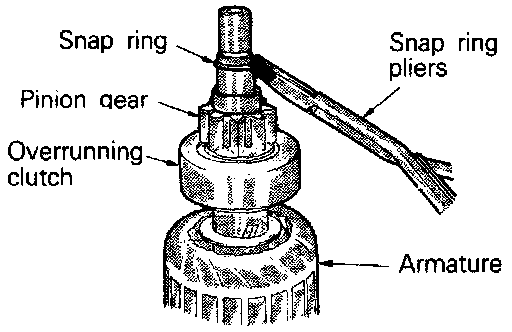 b. Remove snap ring with snap ring pliers and then remove stop ring and overrunning clutch.