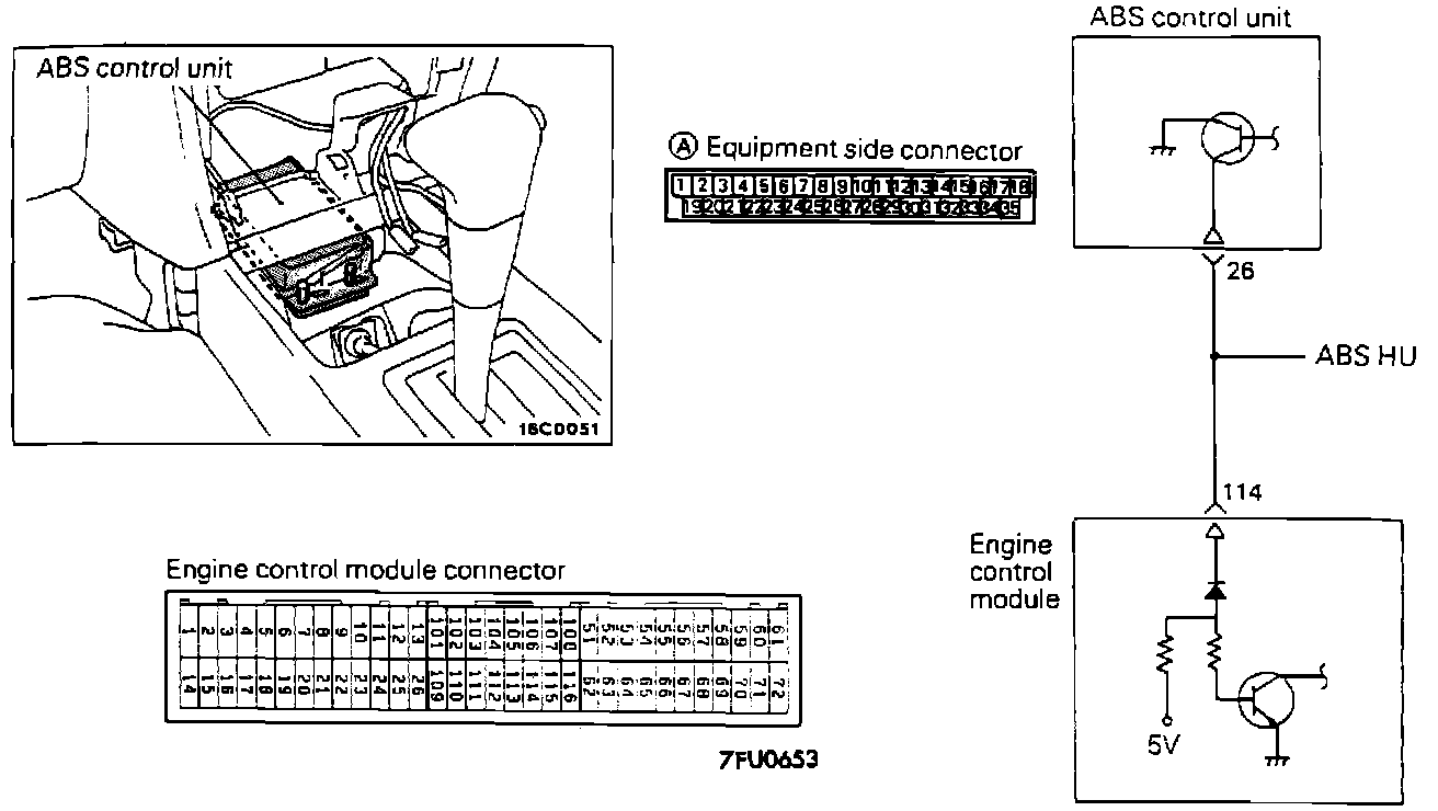 2. Check for continuity between the ABS control module terminal 28 and the Engine Control Module terminal 114.