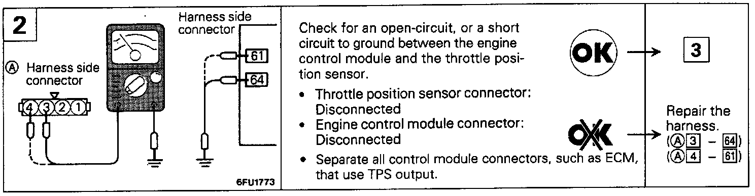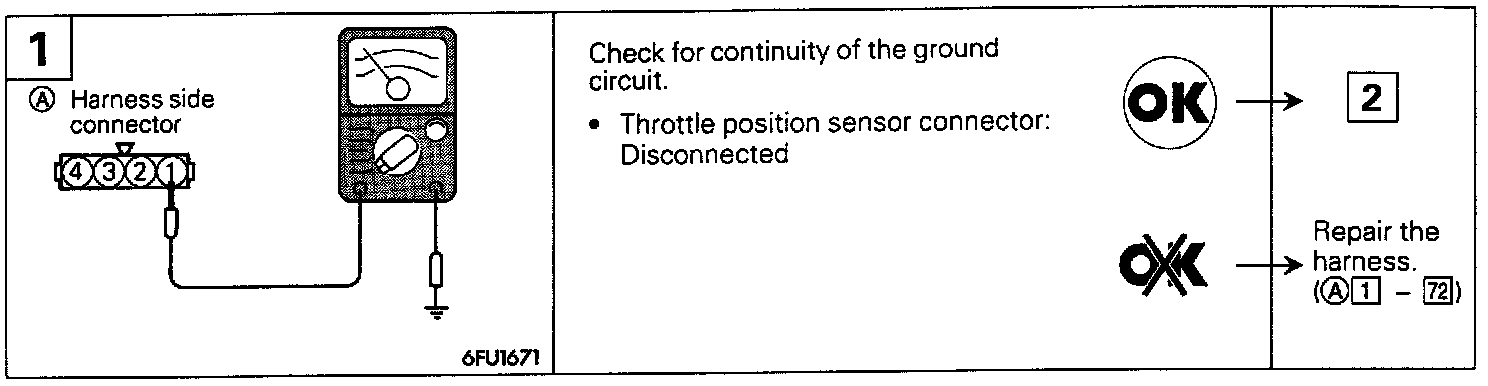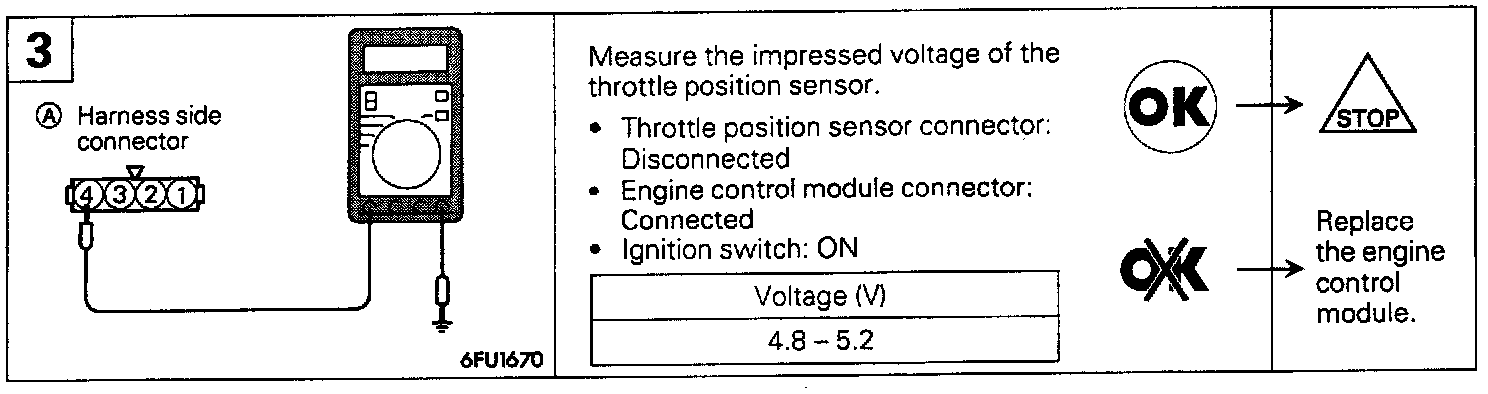 3. Using an analog ohm meter measure the resistance between the throttle position sensor side connector terminal 1 and terminal 3.