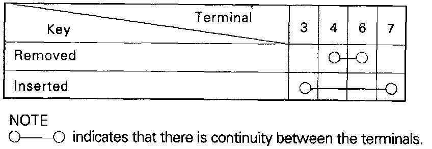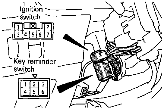 2. Disconnect the wiring connector from the ignition switch and key reminder switch, and connect an ohmmeter to the switch side connecton