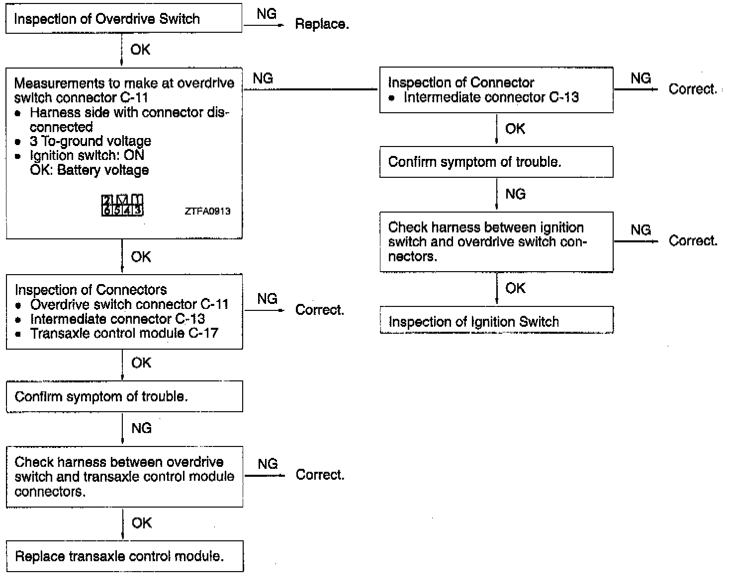 When the overdrive switch system malfunctions, a defective overdrive switch circuit or a defective ignition switch circuit is suspected.