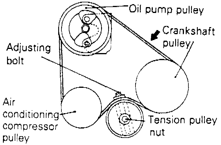 1. Using a suitable belt tension gauge, measure drive belt deflection by pulling or pushing at mid-point of the belt between pulleys shown with a force of 22 lbs.