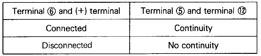 1. Connect the negative (-) terminal of the 1.5 V power supply to terminal No. 5 of the ignition power transistor; then check whether there is continuity between terminal No. 5 and terminal No. 12 when terminal No. 6 and the positive (+) terminal are connected and disconnected.