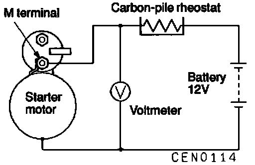 6. Adjust the rheostat so that a voltmeter indicates Approx. 11 V. If the starter motor turns smoothly, it is OK.