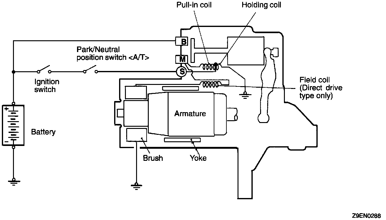 If the ignition switch is turned to the "START" Position. current flows in the Coil provided inside magnetic switch, attracting the plunger. When the plunger is attracted the lever connected to the plunger is actuated to engage the starter clutch.