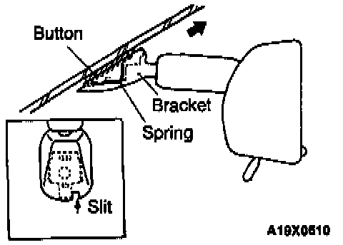 Insert a narrow flat-tip screwdriver into the slit in the inside rear view mirror bracket, keep the spring pushed in and remove the inside rear view mirror in the direction of the arrow in the illustration.