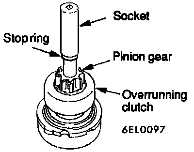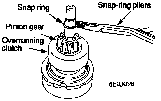 2. After removing the snap ring (by using snap-ring pliers), remove the stop ring and the overrunning clutch.