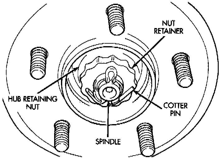 4. Remove the rear hub and bearing assembly cotter pin, nut retainer, wave washer, hub and bearing retaining nut and washer from the rear spindle. Then remove rear hub and bearing assembly from spindle.