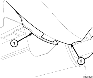 2. Engage the retaining tab securing the splash shield (1) to the rear fascia (2).
