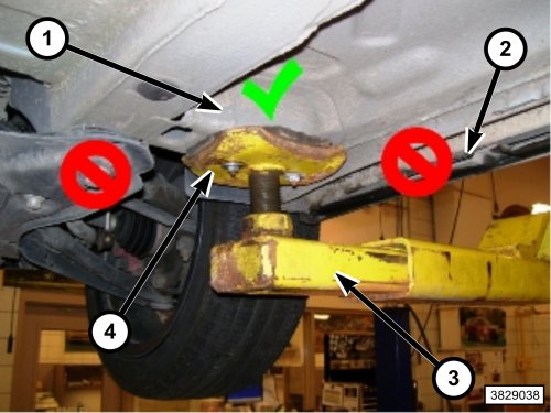 1. Place the front lift pads (4) onto the front floor reinforcement (1).