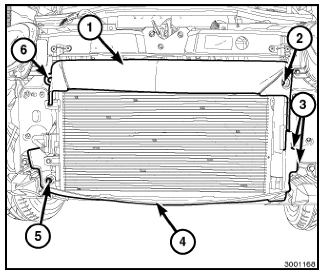 6. Remove the two screws (2 and 6) that secure the upper air dam to the radiator.