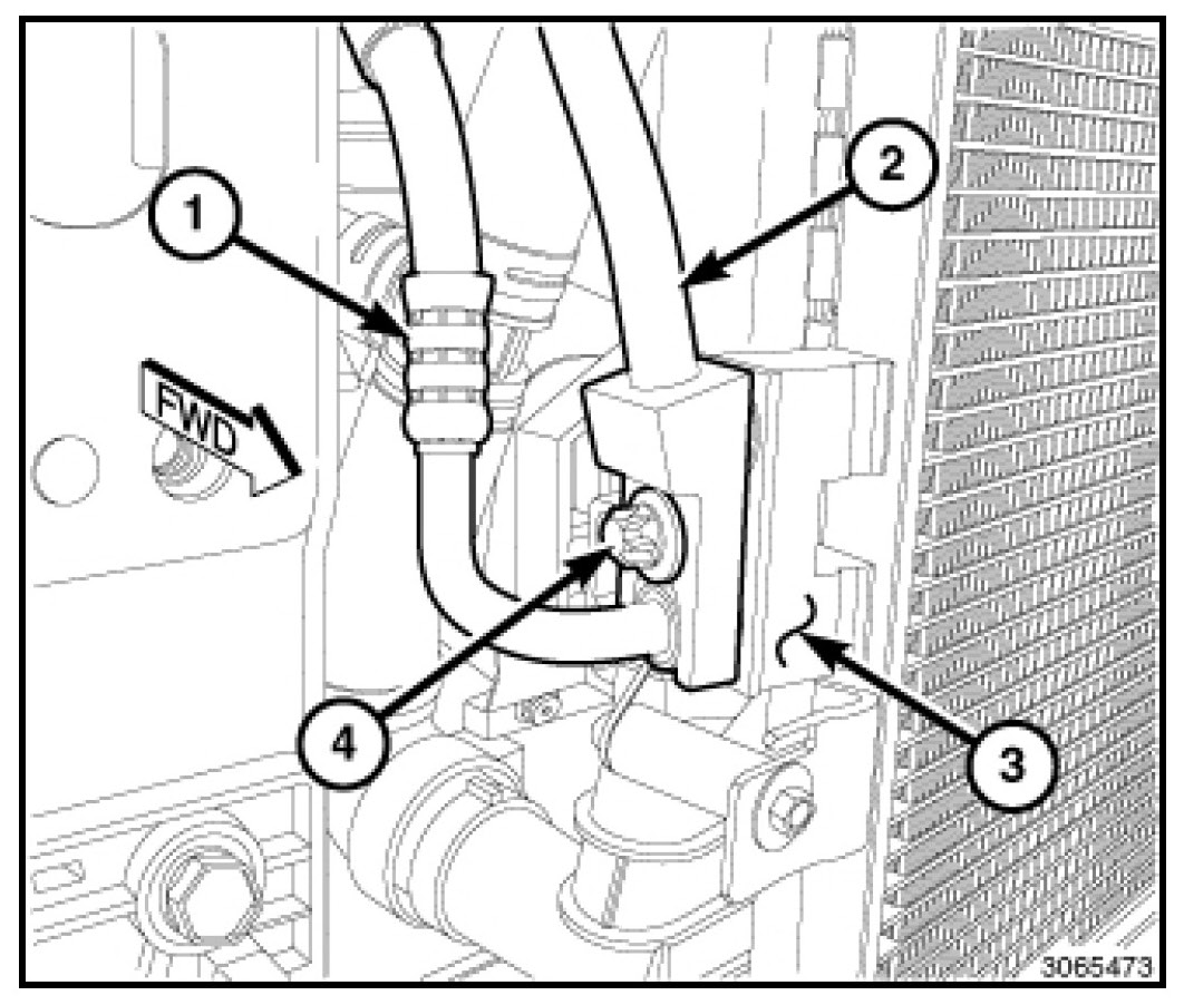 9. Remove the bolt (4) that secures the A/C liquid line (1) and the A/C discharge line (2) to the A/C condenser tapping block (3).