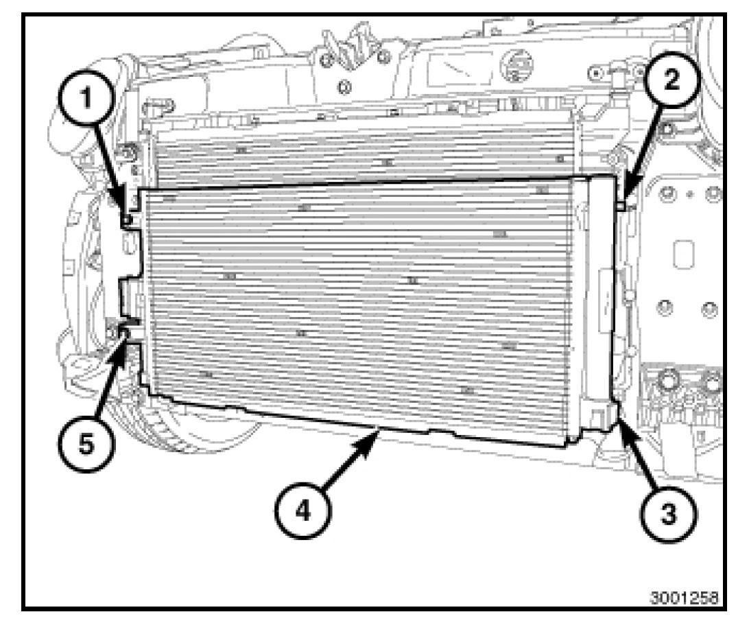 13. Remove the two bolts (1 and 5) that secure right end of the A/C condenser (4) to the radiator.