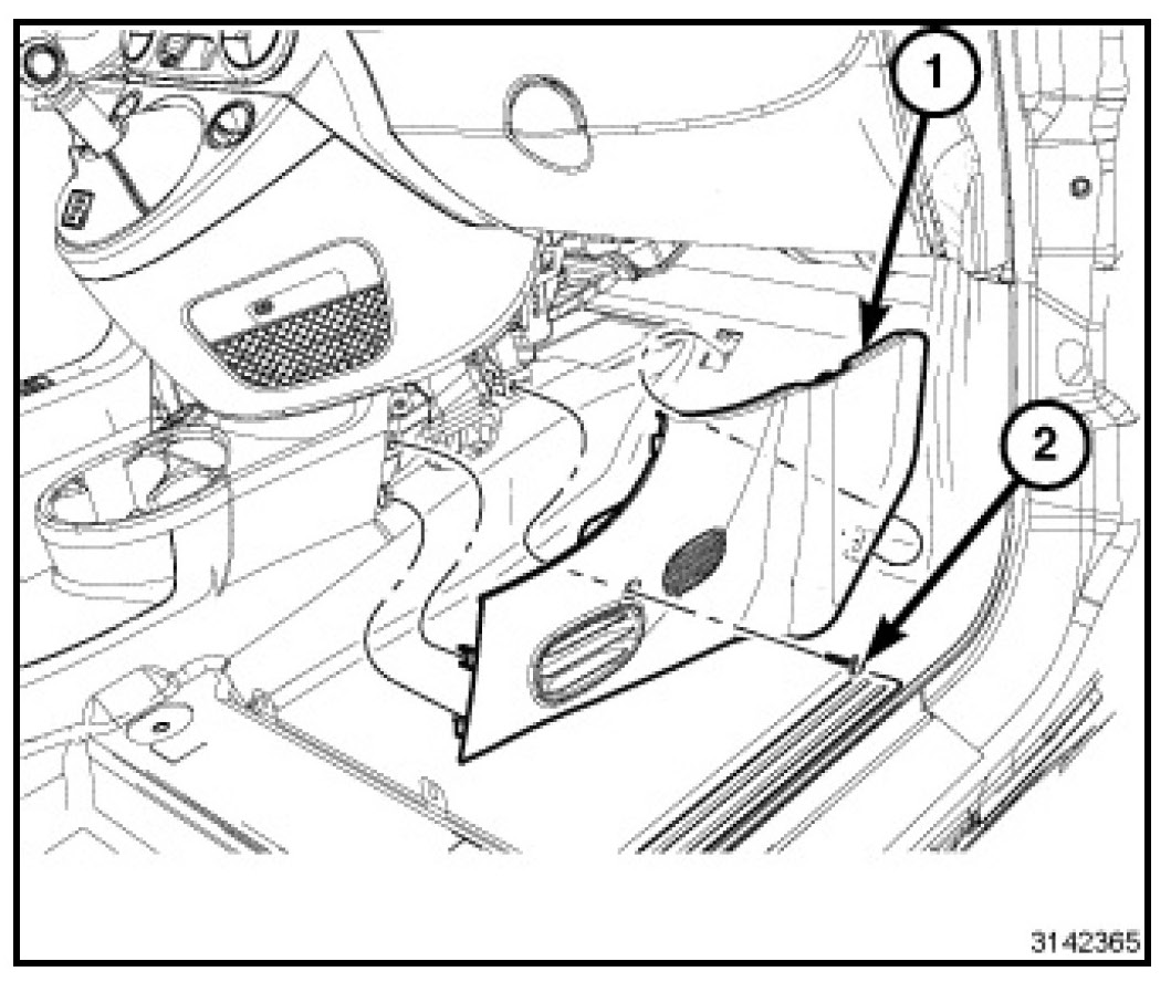 2. Remove the screw (2) that secures the passenger side console closeout cover (1) to the center console support structure of the instrument panel.
