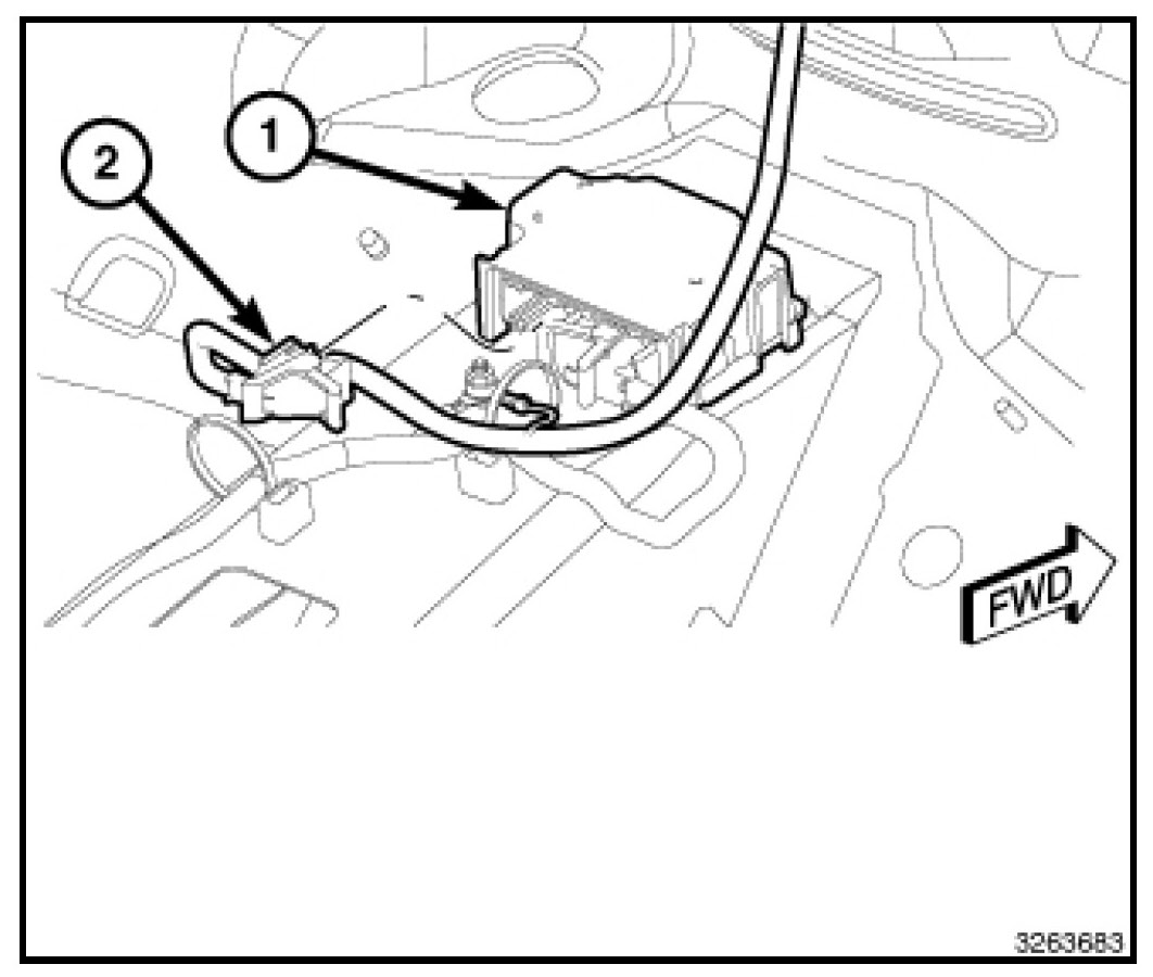 6. Reach around the front edge of the driver side console closeout cover to the front of the floor panel transmission tunnel to access, unlatch and disconnect the wire harness connector (2) from the driver side Occupant Restraint Controller (ORC) (1) connector receptacle located on the rearward facing side of the module. To disconnect the wire harness connector from the ORC, depress the release tab and lift the lever arm on the connector.