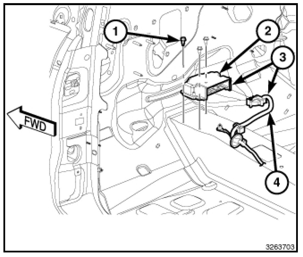 8. Working from the passenger side front of the floor panel transmission tunnel, unlatch and disconnect the body wire harness (4) connector (3) from the passenger side ORC connector receptacle located on the rearward facing side of the module. To disconnect the wire harness connector from the ORC, depress the release tab and lift the lever arm on the connector.