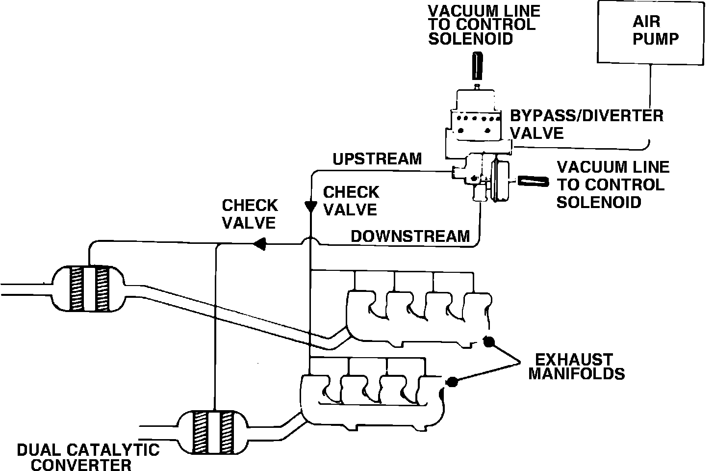 The thermactor air has three possible routings through the bypass/diverter valve, Fig. 14. Downstream air is the air injected into the three way catalyst between the reduction and oxidation catalyst. Upstream air is the air injected into the exhaust manifold. Bypass air is the air bypassed to atmosphere.