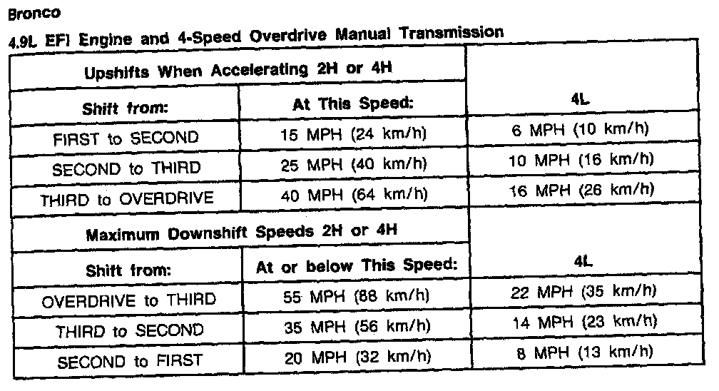 Ford Overdrive 4-spd M/T, Shift Speeds (4.9L Bronco):