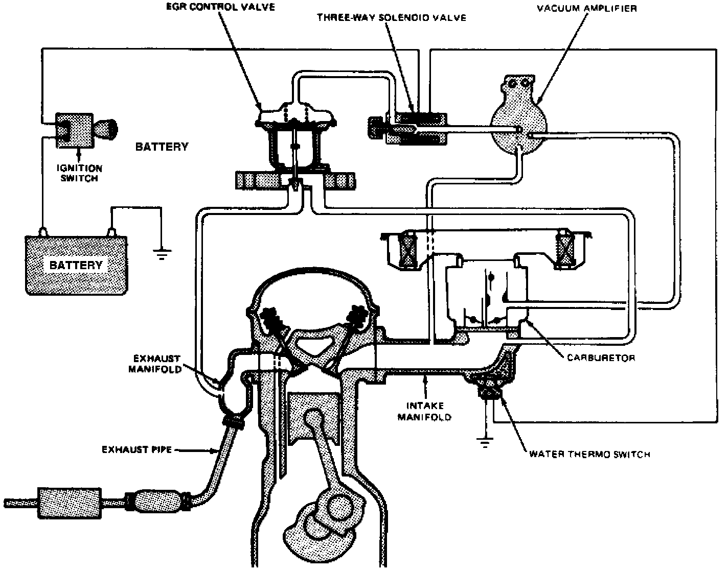 The EGR valve is a vacuum operated, cone type unit. When the valve is open, exhaust gas enters the intake manifold. A three-way solenoid valve is used to control the vacuum supply to the EGR valve. Power to the three-way solenoid is controlled by a water thermo switch. When the water temperature is below 131°F., the switch is closed, in turn energizing the three-way solenoid valve. The solenoid valve then closes the vacuum passage within the valve and cutting vacuum to the EGR valve. When water temperature is above 131°F., the water thermo switch is open, deenergizing the three-way solenoid valve. The vacuum passage within the valve is open, permitting intake manifold vacuum to control the EGR valve diaphragm. A vacuum amplifier is used to supply varying amounts of vacuum to the EGR valve diaphragm to actuate the valve during acceleration or at various engine speeds.