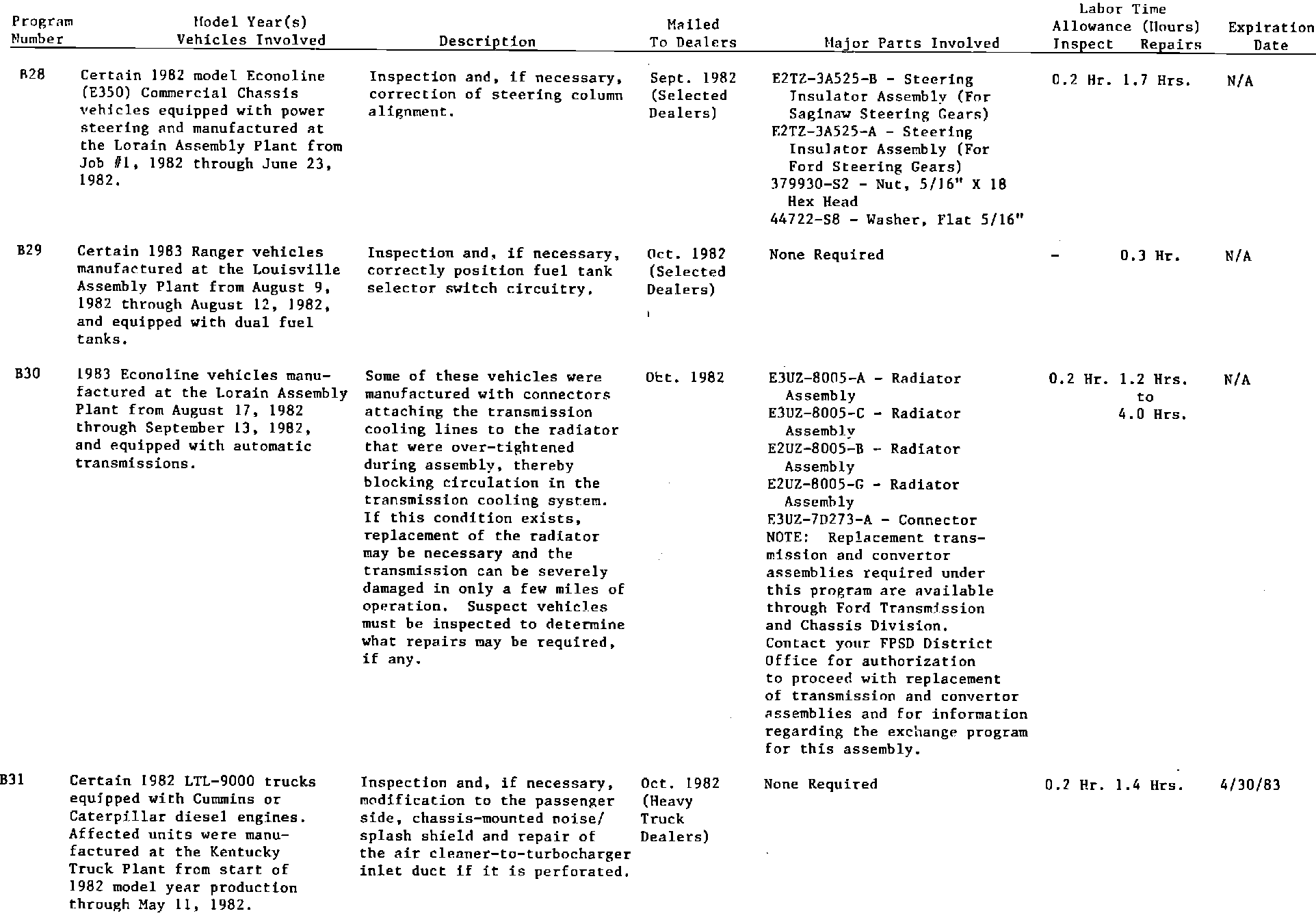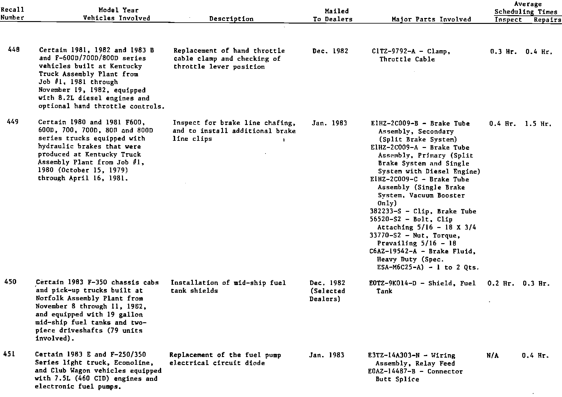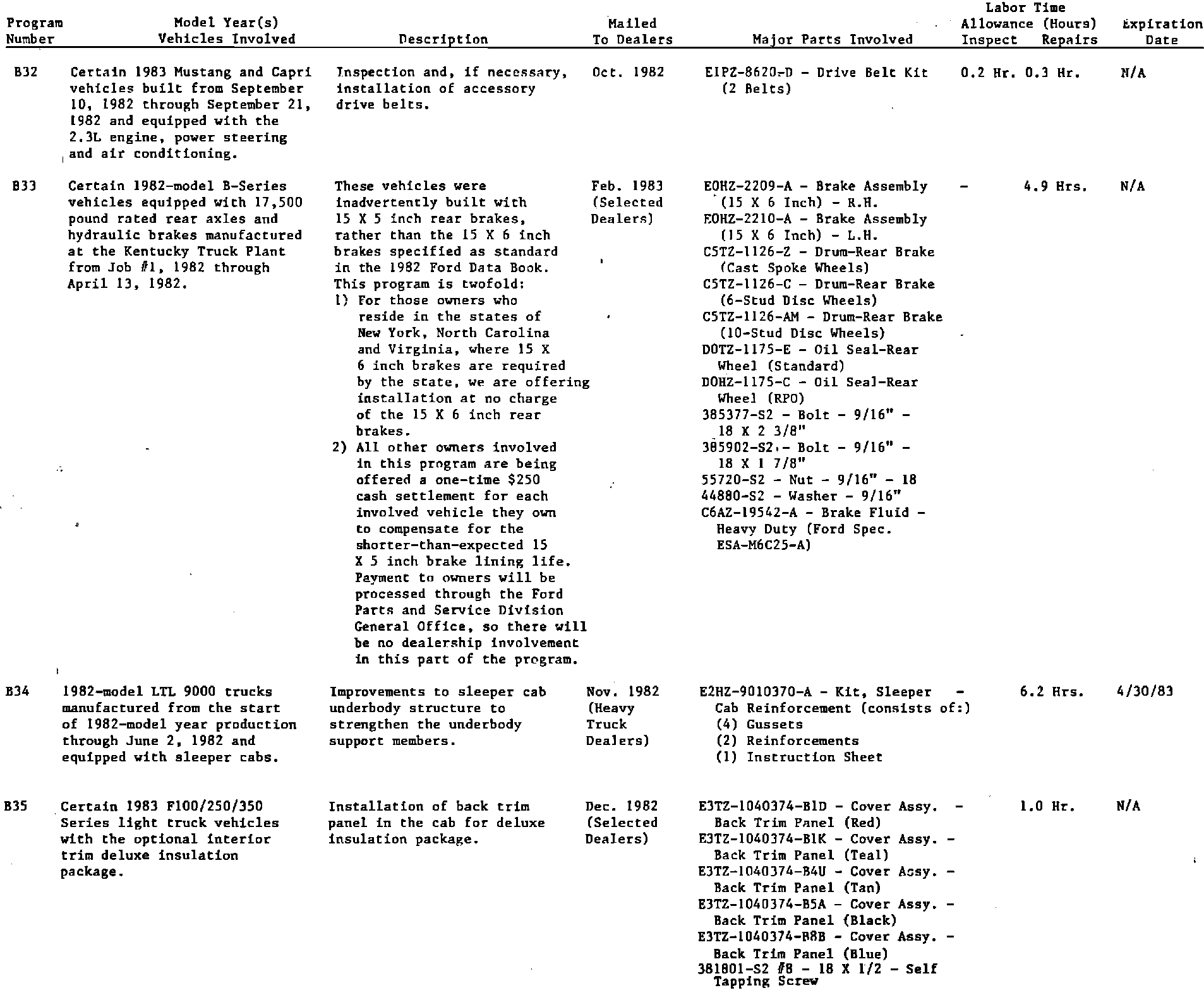 Attached is a listing of recalls launched from July 1982 to date. It is organized to provide quick access to important information about each recall such as the units involved, major parts required, and appropriate times that you may wish to use for scheduling of repairs.