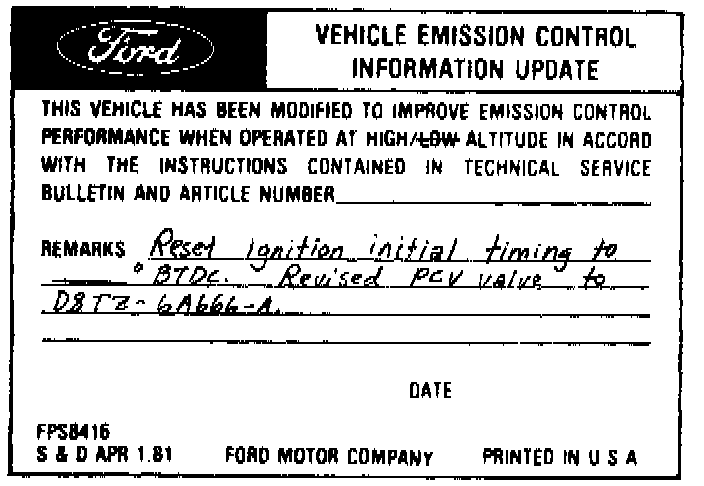 If the vehicle is returned to continuous sea level (below 4,000 ft. alt.) operation, the above procedures should be reversed and the Vehicle Emission Control Information Update Label should be removed from the vehicle.