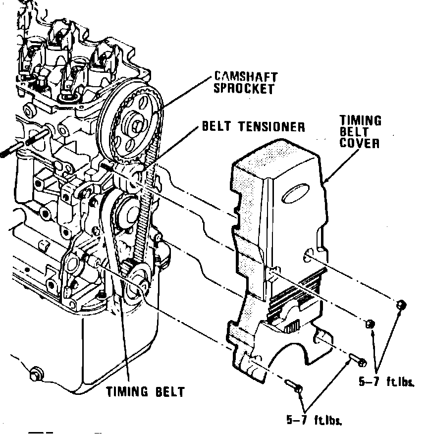 14. Secure crankshaft so it cannot rotate, then using tool No. D81P-6256 or equivalent and a torque wrench, turn camshaft sprocket counterclockwise. Tighten timing belt tensioner attaching bolt when torque wrench indicates 27-32 ft. lbs., for a new timing belt and 10 ft. lbs., for a used timing belt. Engine must be cold when torque is applied to camshaft sprocket.