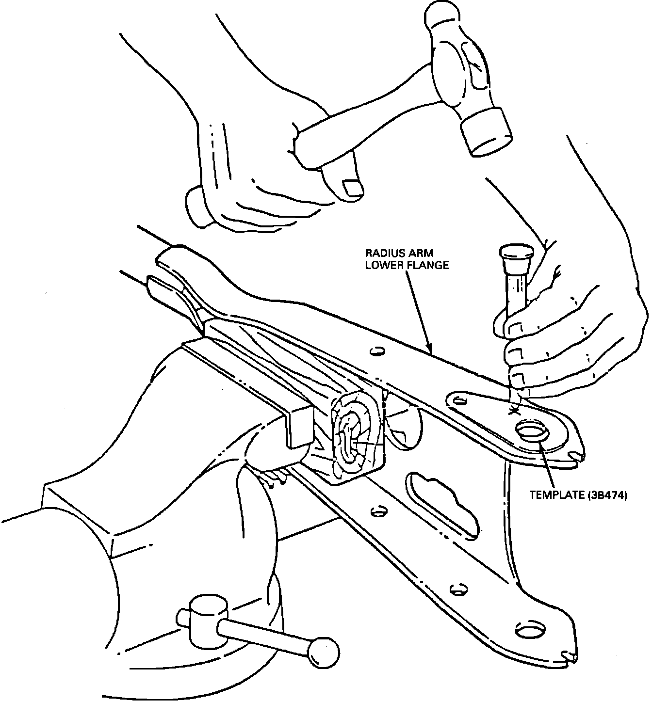 2. Locate the template (3B474) on the bottom flange of the radius arm. Refer to Figure 8 for a typical arm modification for the right hand radius arm. One template per vehicle model is used to modify both the right and left hand radius arms. When modifying the right hand arm, position the template with the printed side downward. The template locates off of one of two existing holes in the radius arm. The E100-350 template is shaped to match the contours of the radius arm.