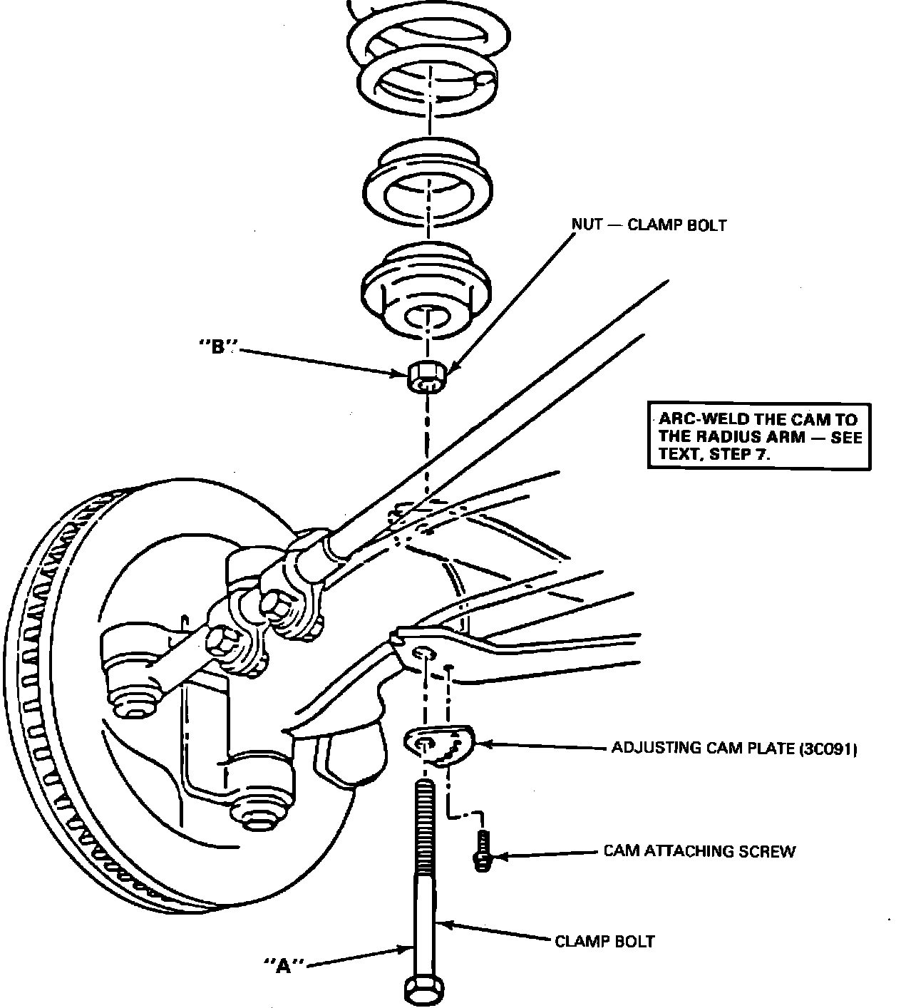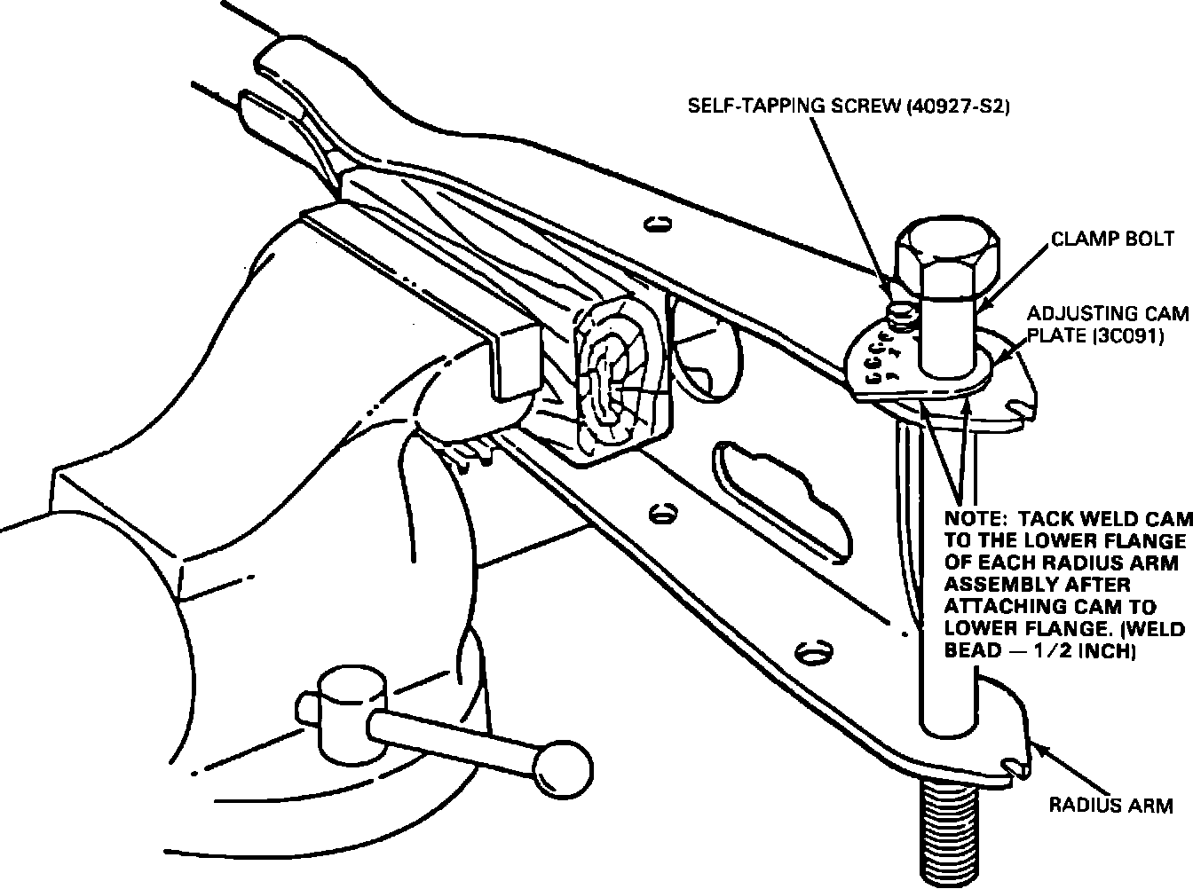 7. Reset front wheel toe after installation is complete. AFTER THE DESIRED ALIGNMENT IS ASSURED THE CAM MUST BE WELDED TO THE ARM ARC WELD ONE INCH MINIMUM LENGTH ALONG TWO SIDES OF THE CAM.