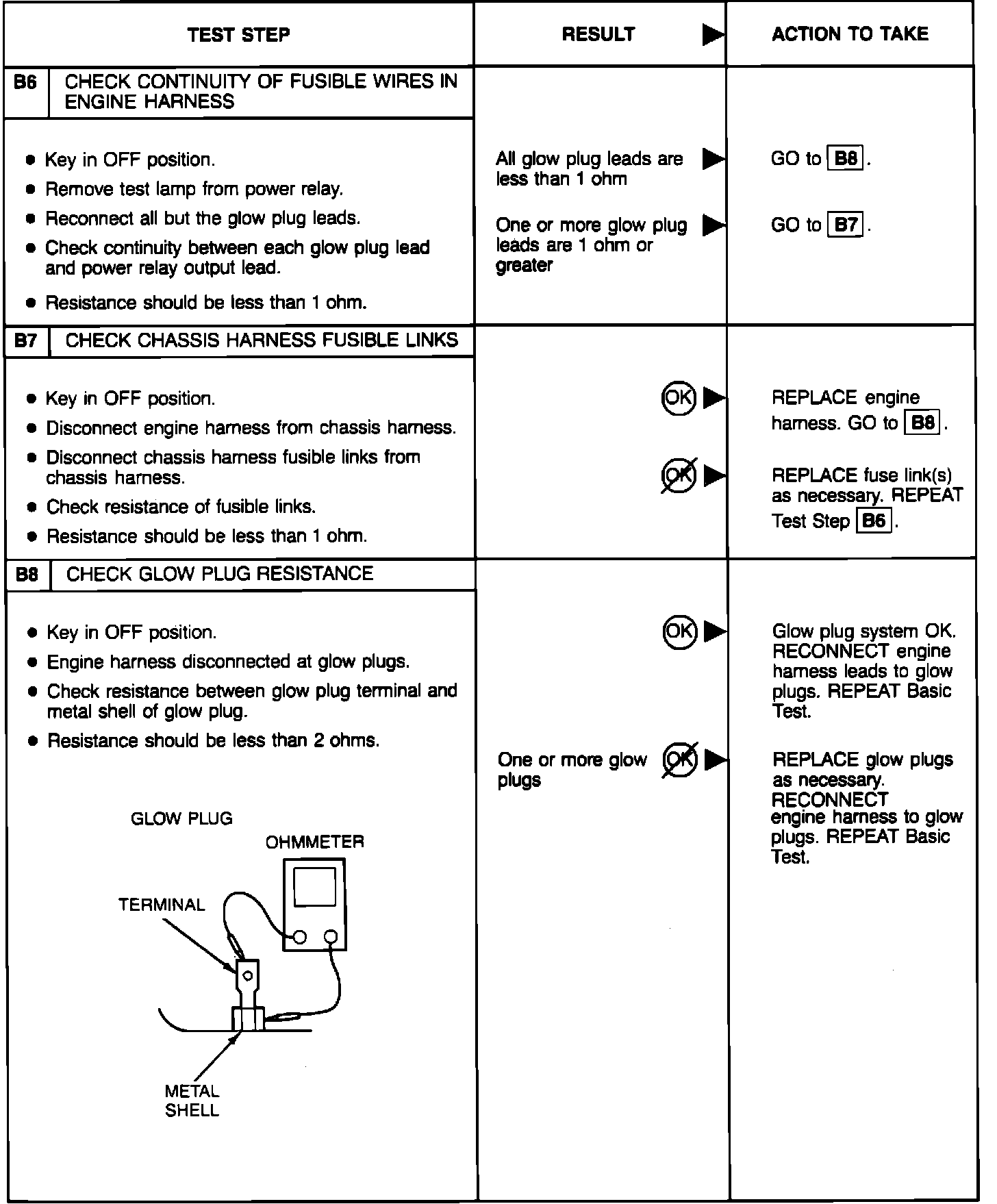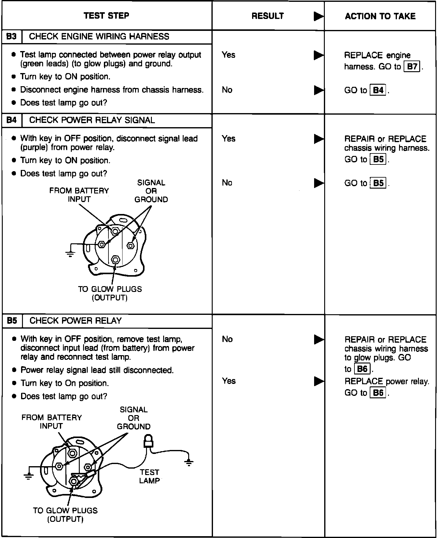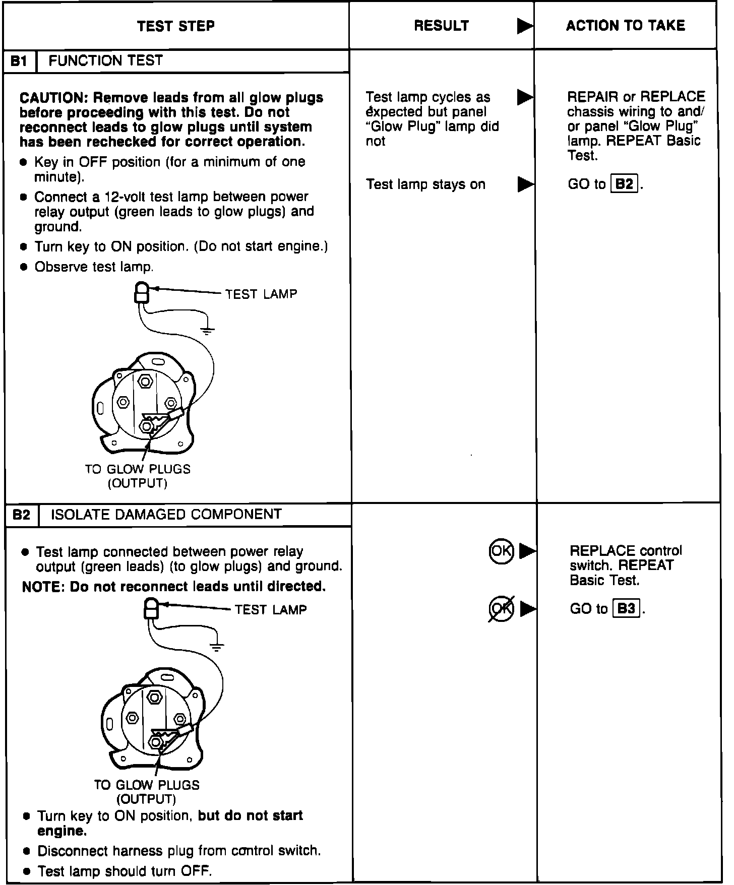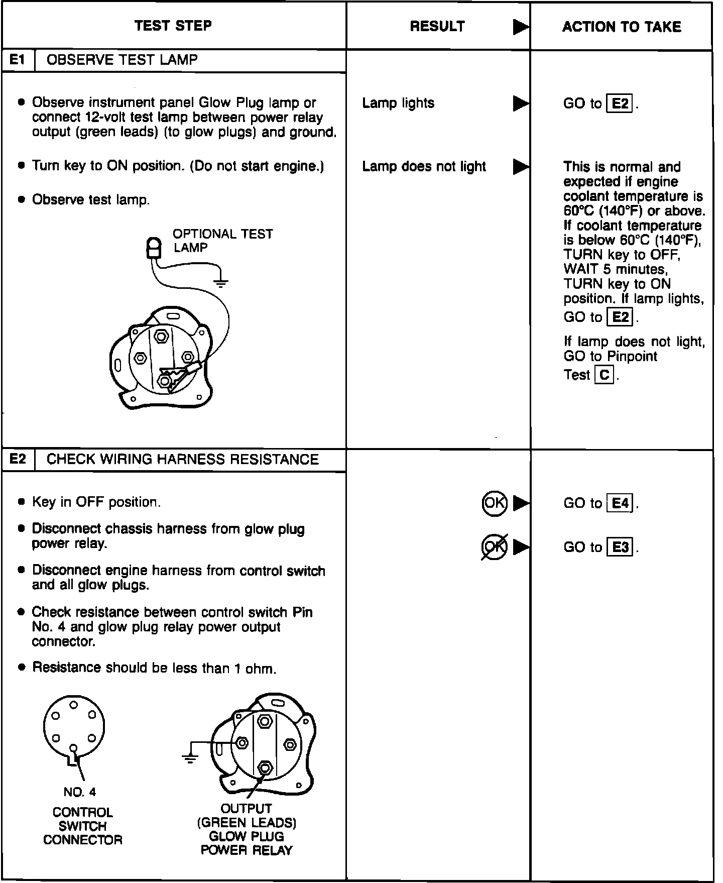 Perform the glow plug system diagnostic test (referred as Basic test) first. If the vehicle passes the Basic test without running any Pinpoint tests, you will know the glow plug system is functioning properly. The vehicle's problem exists somewhere else other than the glow plug system. If a step of the Basic test fails, run only the Pinpoint test specified by the failed step. Refer to glow plug diagnostic test point chart for test lamp connections and glow plug system wiring harness test points. Perform only those services specified by the Pinpoint tests. Operation of the glow plug system is completely automatic. If after completing a specific Pinpoint test it is determined that a component must be replaced, the glow plugs should be disconnected until the system has been rechecked by repeating the Basic test to make sure the glow plug system works properly.