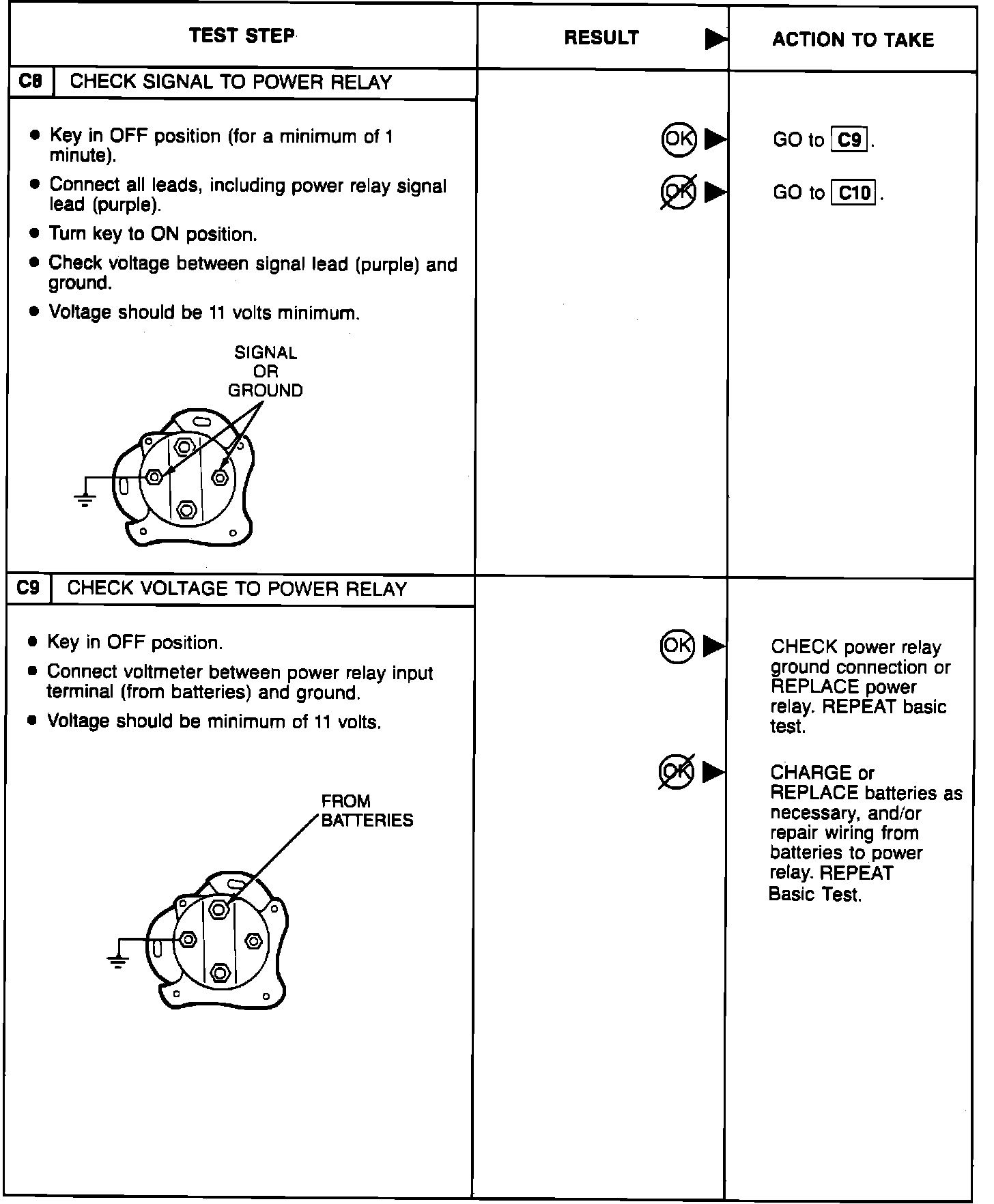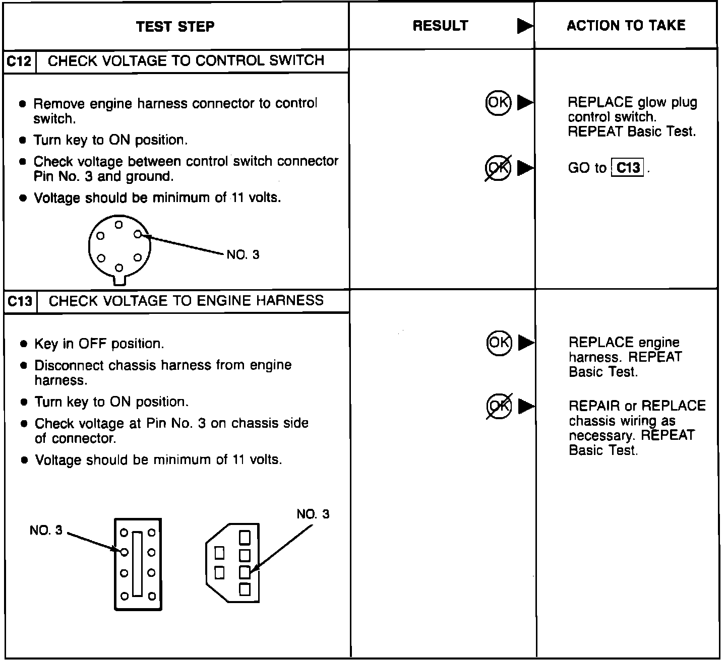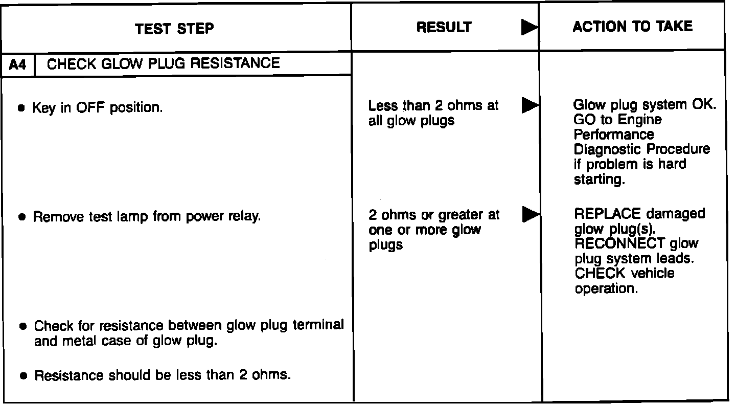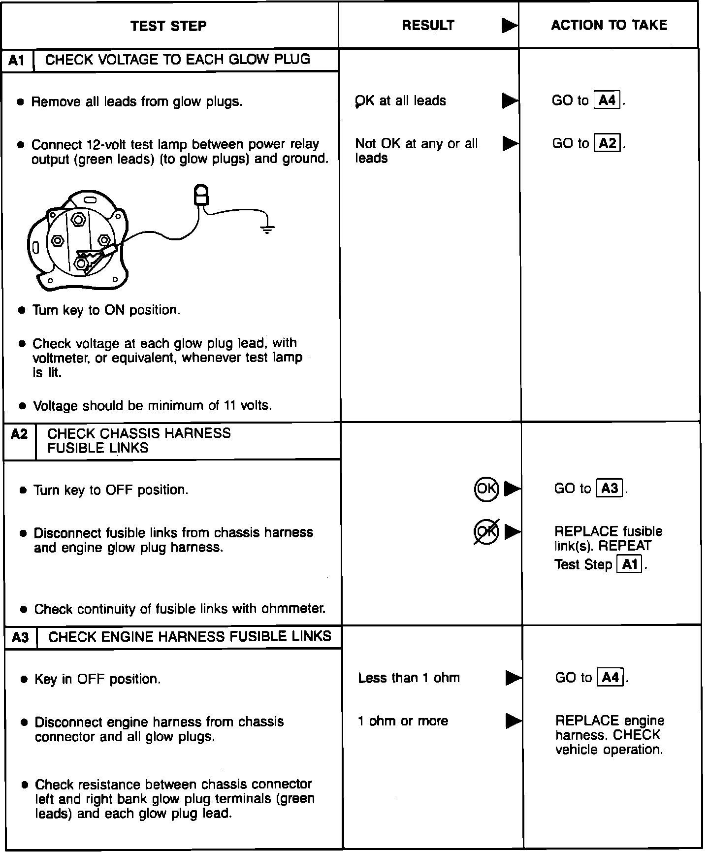 Perform the glow plug system diagnostic test (referred as Basic test) first. If the vehicle passes the Basic test without running any Pinpoint tests, you will know the glow plug system is functioning properly. The vehicle's problem exists somewhere else other than the glow plug system. If a step of the Basic test fails, run only the Pinpoint test specified by the failed step. Refer to glow plug diagnostic test point chart for test lamp connections and glow plug system wiring harness test points. Perform only those services specified by the Pinpoint tests. Operation of the glow plug system is completely automatic. If after completing a specific Pinpoint test it is determined that a component must be replaced, the glow plugs should be disconnected until the system has been rechecked by repeating the Basic test to make sure the glow plug system works properly.