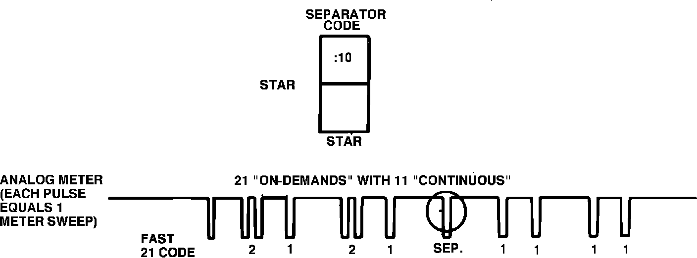 A single 1/2 second separator pulse is issued 6 - 9 seconds after the last functional test code (Key ON/Engine OFF only). Then 6 - 9 seconds after the single 1/2 second separator pulse, the continuous codes will be issued,