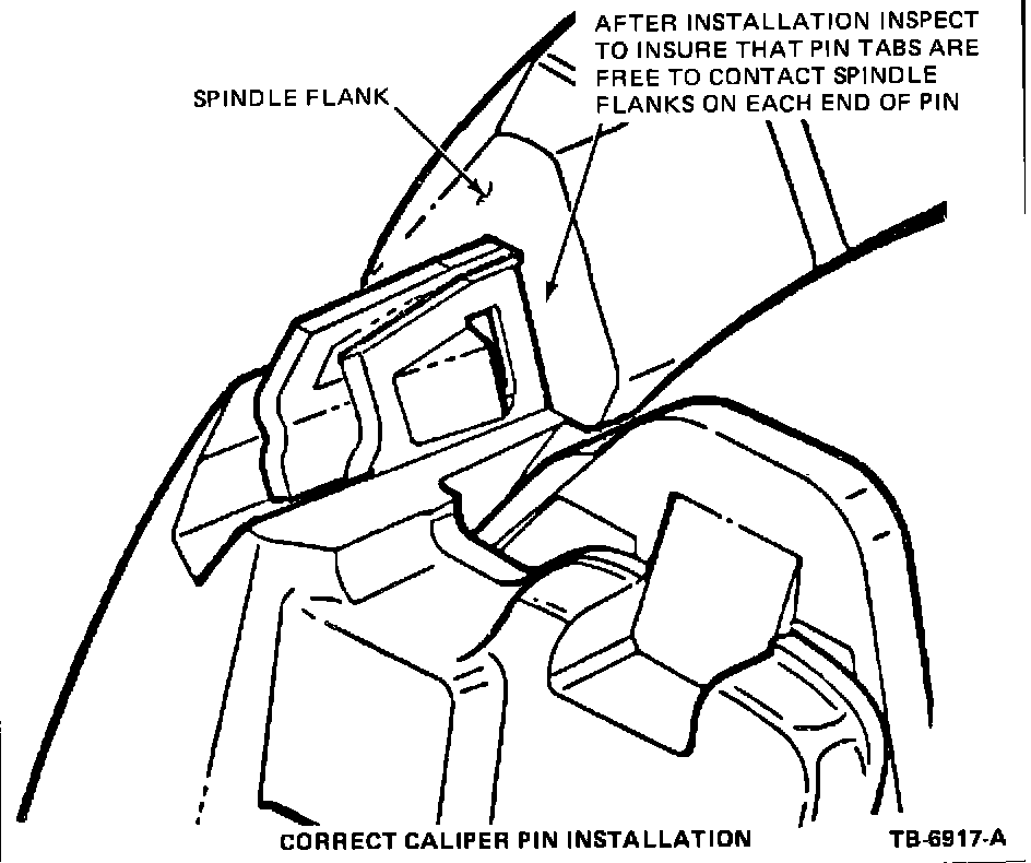 CAUTION: DURING THE INSTALLATION PROCEDURE DO NOT ALLOW THE TABS OF THE CALIPER PIN TO BE TAPPED TOO FAR INTO THE SPINDLE GROOVE. IF THIS HAPPENS IT WILL BE NECESSARY TO TAP THE OTHER END OF THE CALIPER PIN UNTIL THE TABS SNAP INTO PLACE. THE TABS ON EACH END OF THE CALIPER PIN MUST BE FREE TO CATCH ON THE SPINDLE FLANKS. SEE FIGURE 9.