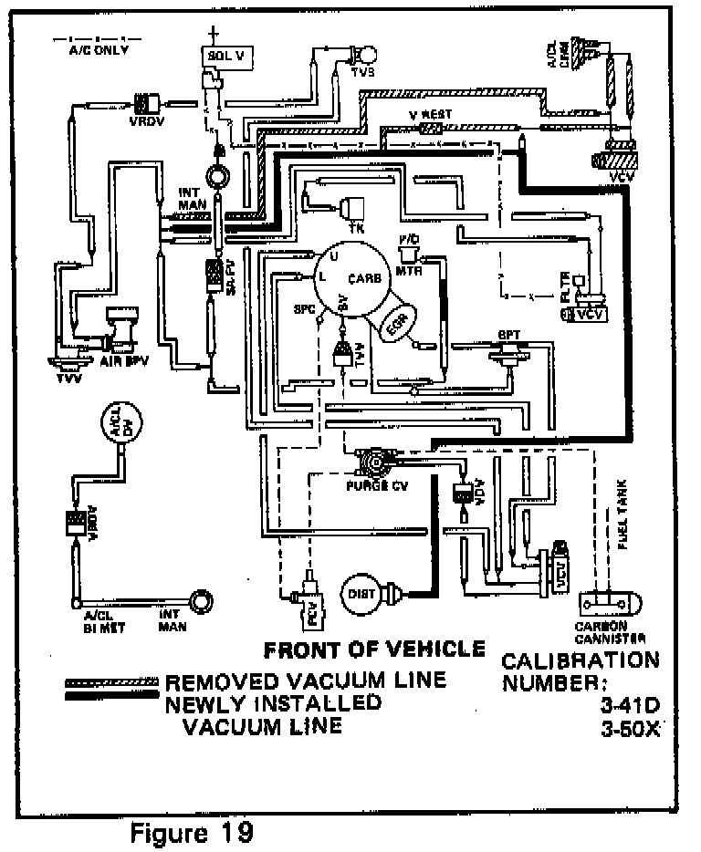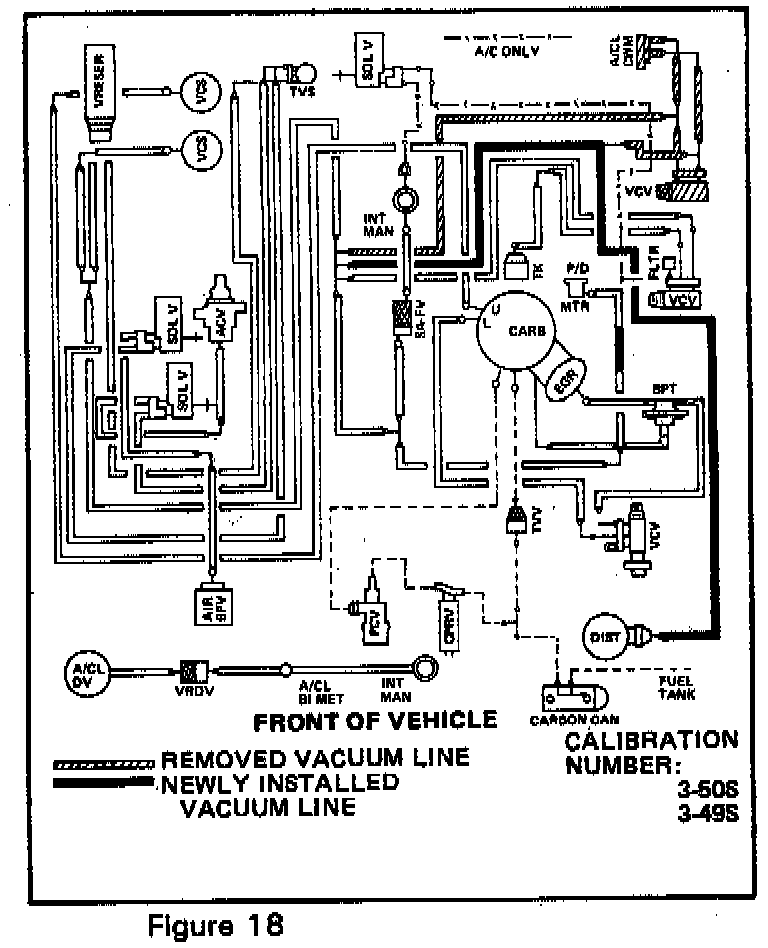 If one of the subject vehicles/engine calibrations experiences unacceptable tip-in detonation (a slight amount of tip-in detonation is acceptable), the following procedure and vacuum schematics, Figures 18 and 19, outlining rerouting of the distributor advance vacuum source may be followed to alleviate the concern.