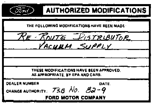 6. Obtain an Authorized Modifications decal and list the date, dealer number, alterations performed, and the change authority (TSB number and article) as shown below. Select a prominent place adjacent to the Vehicle Emission Control Information decal suitable for installing the Authorized Modifications decal. Clean the area, install the decal and cover it with a clear plastic decal shield.