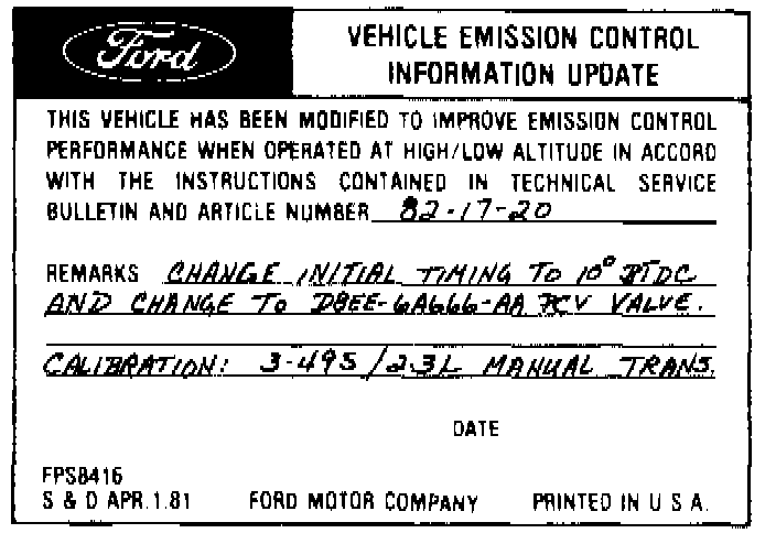 Obtain a Vehicle Emission Control Information Update Label (available at all Ford or Lincoln-Mercury dealers) and fill in the appropriate information. In the top paragraph of the label, cross off the altitude (HIGH or LOW) that does not apply and enter the number of the Technical Service Bulletin and Article number that provided the modification instructions. Write in the remarks as illustrated in the appropriate Article, including the new specifications where a space has been provided and the actual numbers have been left blank. At the bottom of the label, enter the date the modification was performed. Select a prominent place adjacent to the Vehicle Emission Control Information decal suitable for installing the label. Do not install the label on any component that can be easily detached from the vehicle. Clean the area, install the label and cover it with a clear plastic decal shield.