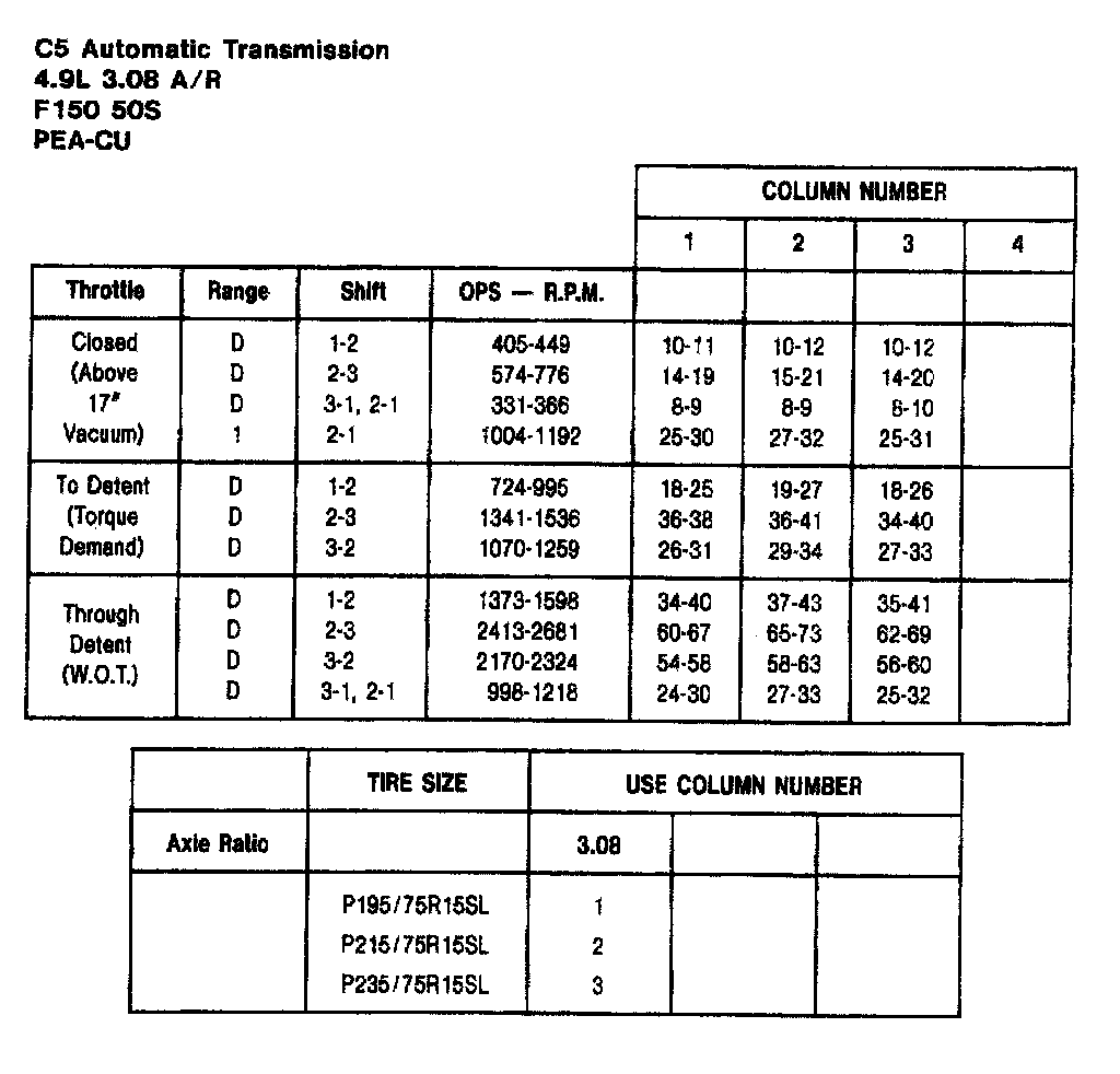 C5 3-spd A/T, Shift Speeds (4.9L F150):