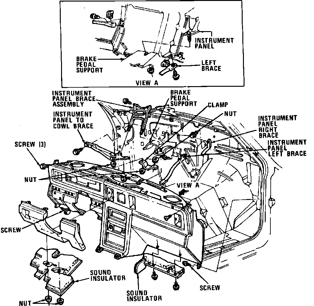 13. Remove brake pedal support attaching nut from lower edge of instrument panel.
