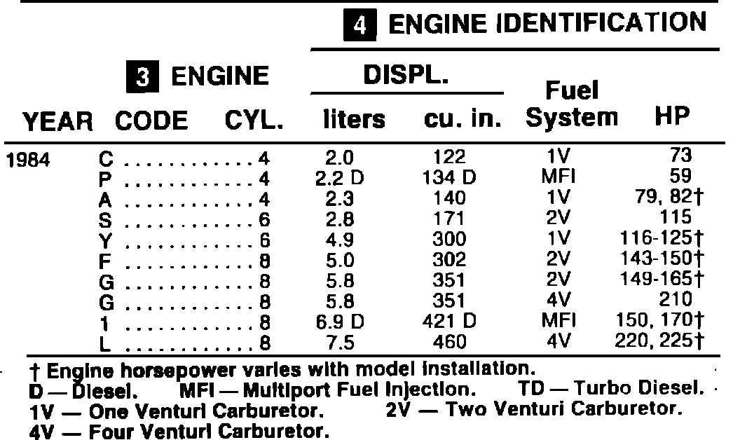 (4) ENGINE IDENTIFICATION: On the line where the engine code appears, read to the right to identify the engine.