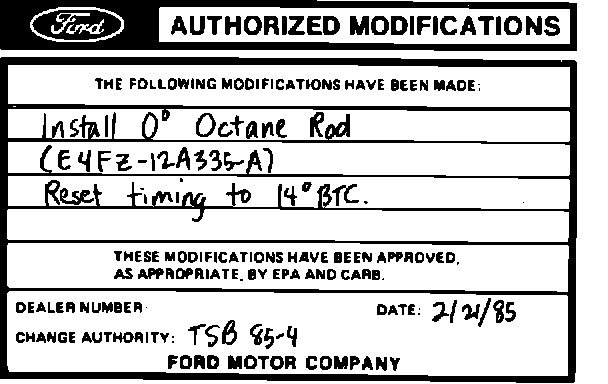 The subject vehicles may be equipped with a 4~ advance octane rod (Part No. E4EE-12A355-CA, color coded black).