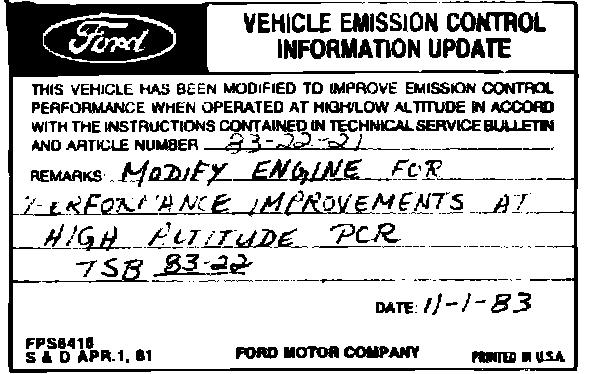 Obtain a Vehicle Emission Control Information Update Label (available at all Ford or Lincoln-Mercury dealers) and fill in the appropriate information. In the top paragraph of the label, cross off the altitude (HIGH or LOW) that does not apply and enter the number of the Technical Service Bulletin and Article number that provided the modification instructions. Write in the remarks