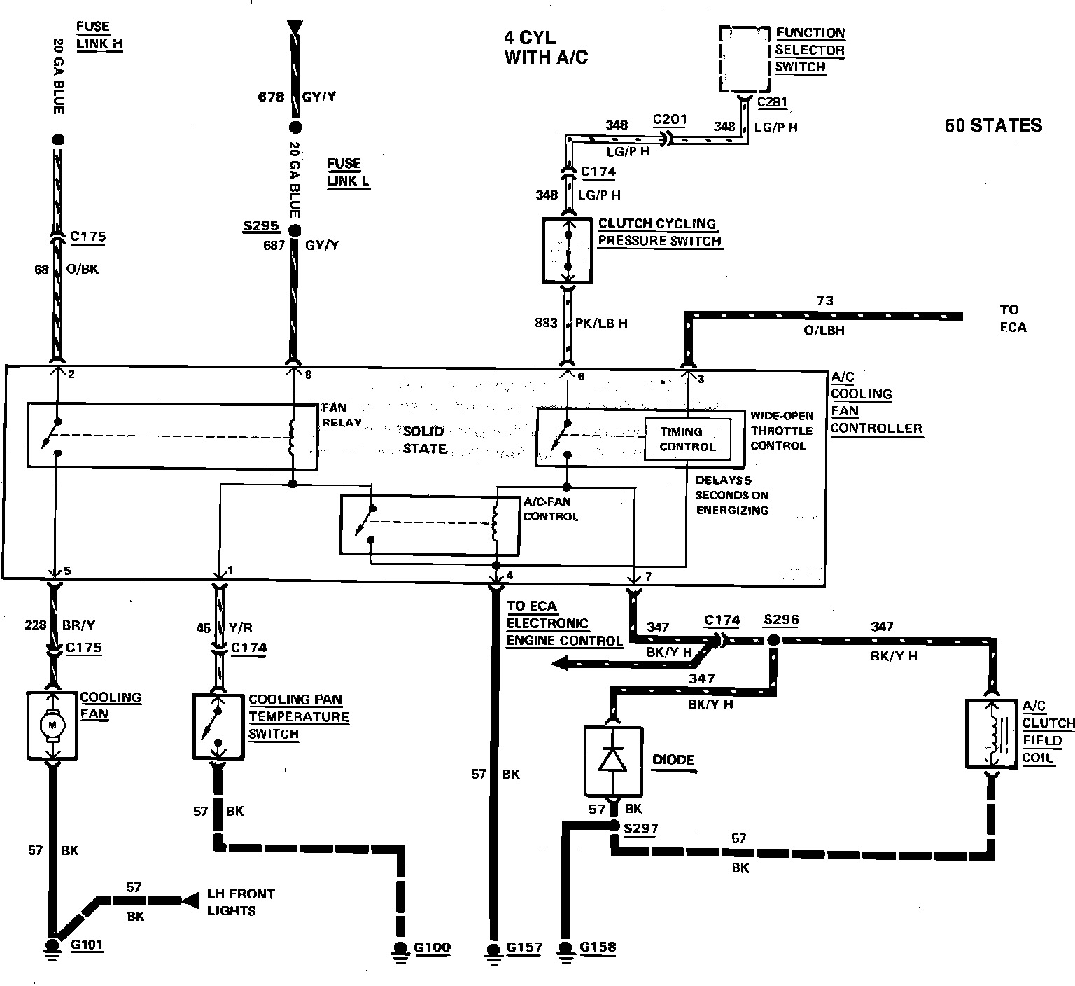 Fig. 7 Air Conditioning Compressor Clutch & Cooling Fan Wiring Circuit. 1984 LTD & Marquis with 4 Cylinder Engine: