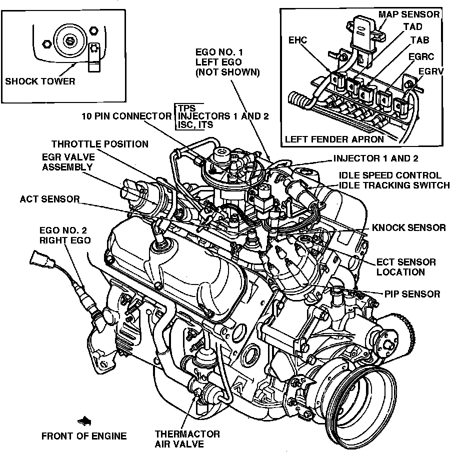 Fig. 3 EEC-IV system component location. 1984 V6-232 CFI engine, front view of engine: