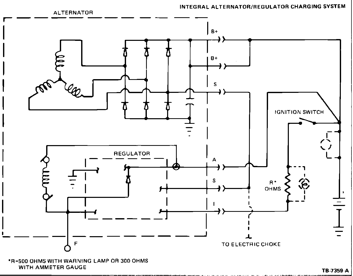 On warning lamp equipped vehicles, the warning lamp is connected across the terminals of a 500 ohm resistor at the instrument cluster. Current passes through the warning lamp when the ignition switch is in the RUN position and there is no voltage at terminal S. When voltage at S rises to a pre-set value, the regulator switching circuits stop and flow of current into terminal I and the lamp turns OFF.