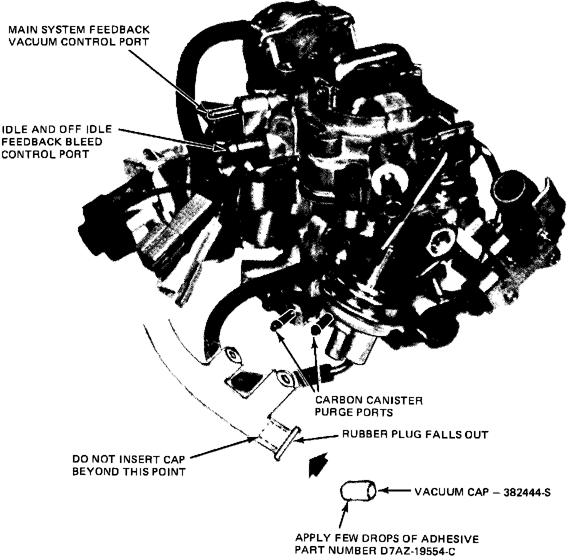 2. If plug is missing install rubber vacuum cap, part no. 382444-S, with a few drops of adhesive, part no. D7AZ-19554-C as shown.