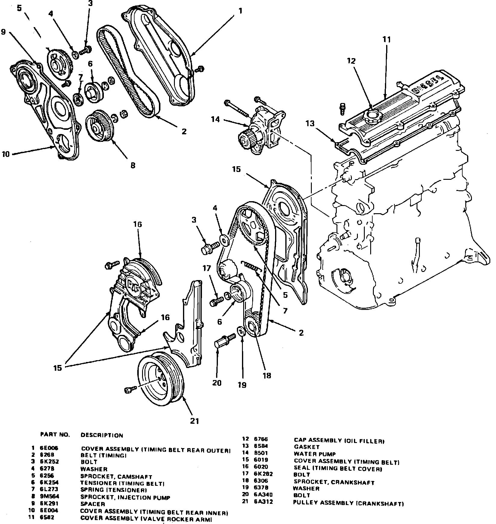6. Install rear timing belt cover. Torque the 6 mm rear cover bolts to 5---9 ft. lbs., torque the 8 mm rear cover bolts to 12---16 ft. lbs.